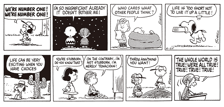 「ペパーミント パティ」が「全世界はマル!わたしたちはみんなマル!マル!マル!マル!」とコミックで言っているように、『ピーナッツ』の個性的な仲間たちは“自分自身のまま、自分らしく生きていいんだよ”とコミックで伝えています。