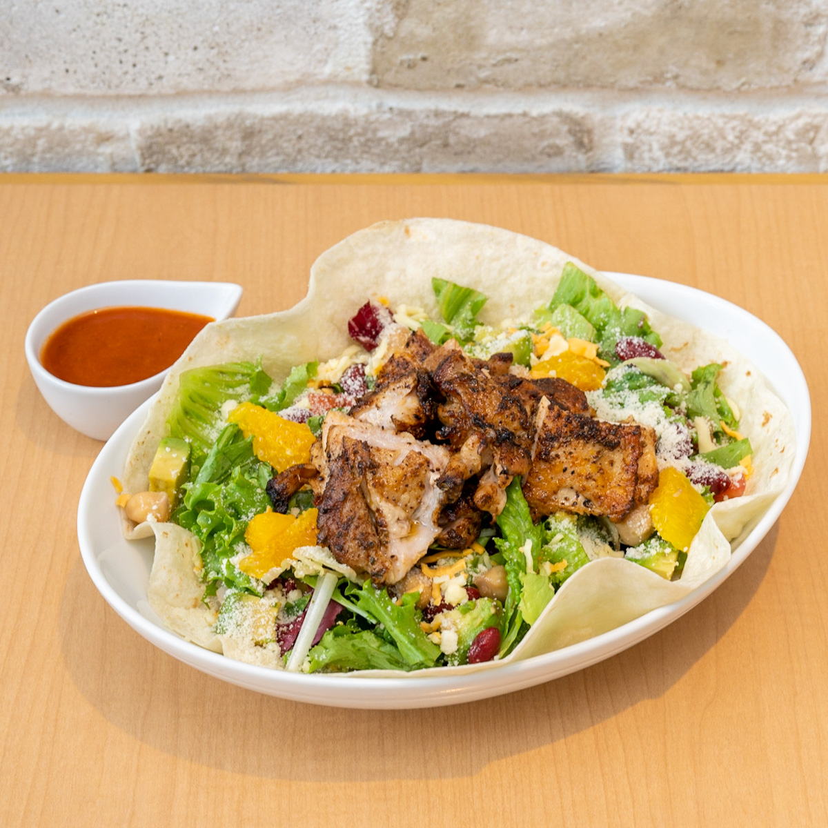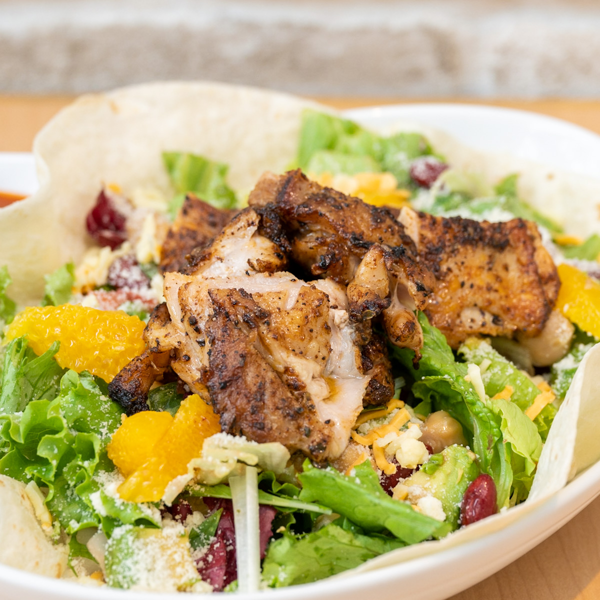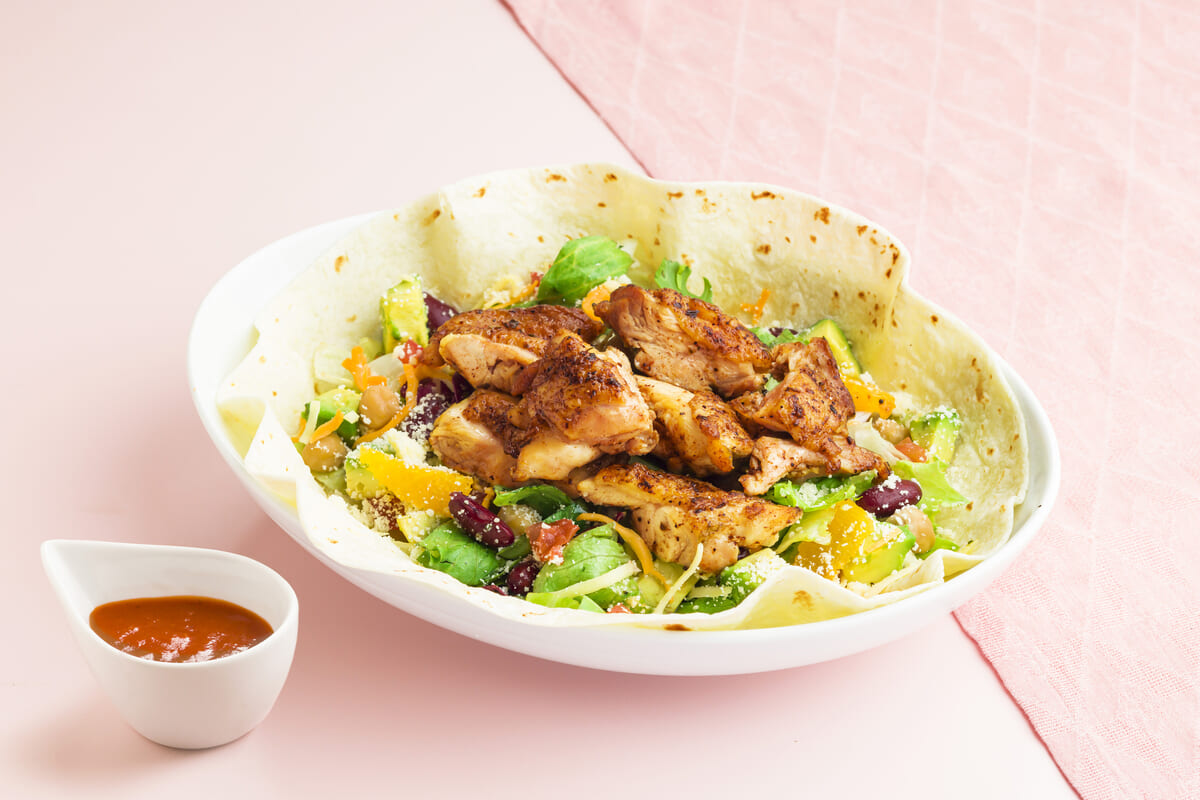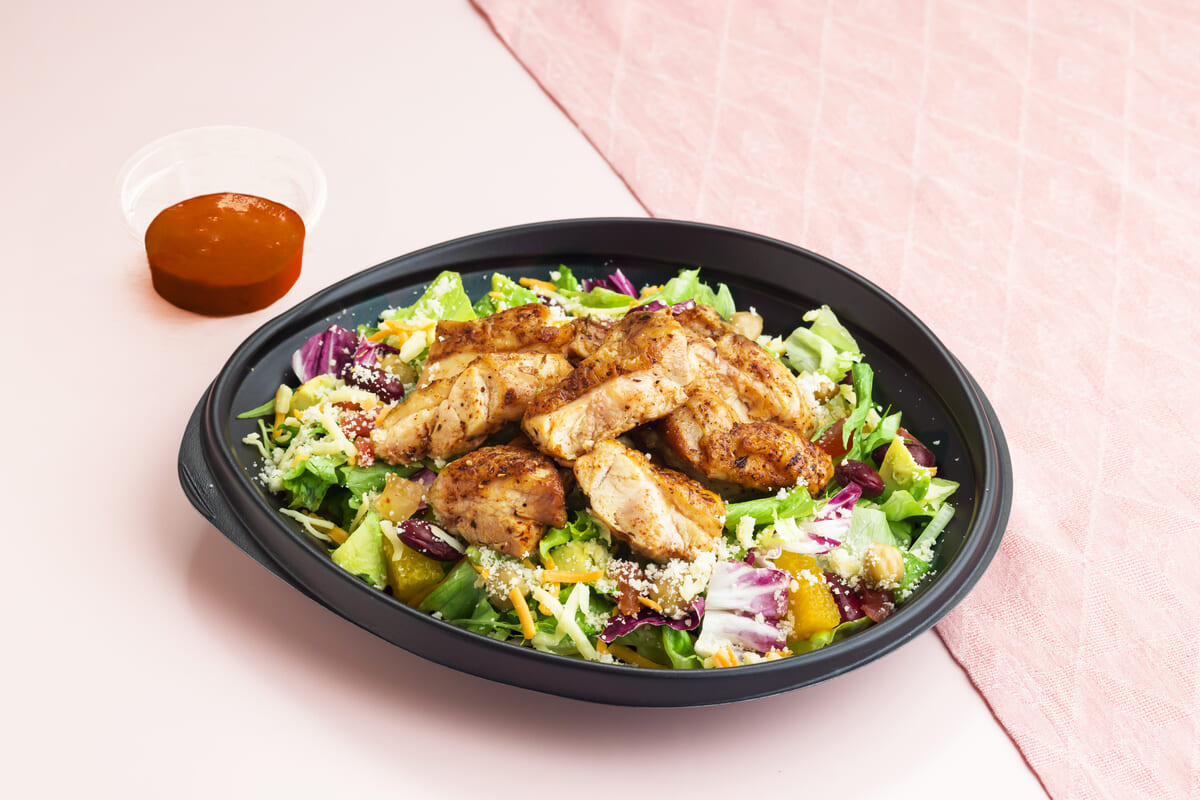 スパイスの効いたケイジャンチキンをのせたパワーサラダ。