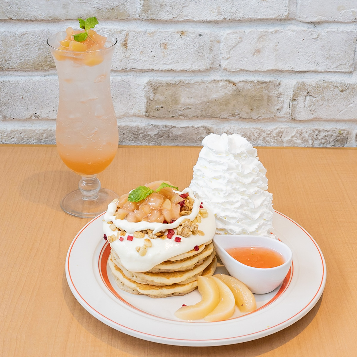 「白桃のパンケーキ」とあわせていただきたい季節限定ドリンク「ピーチスカッシュ」とあわせて紹介していきます。
