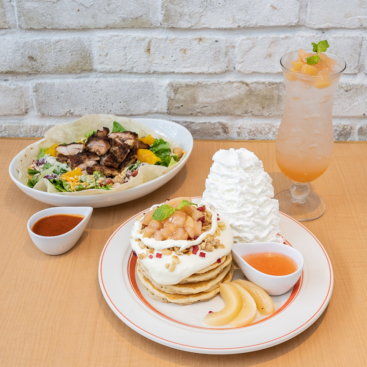 Eggs ’n Things「白桃のパンケーキ」「ケイジャンチキンサラダ」