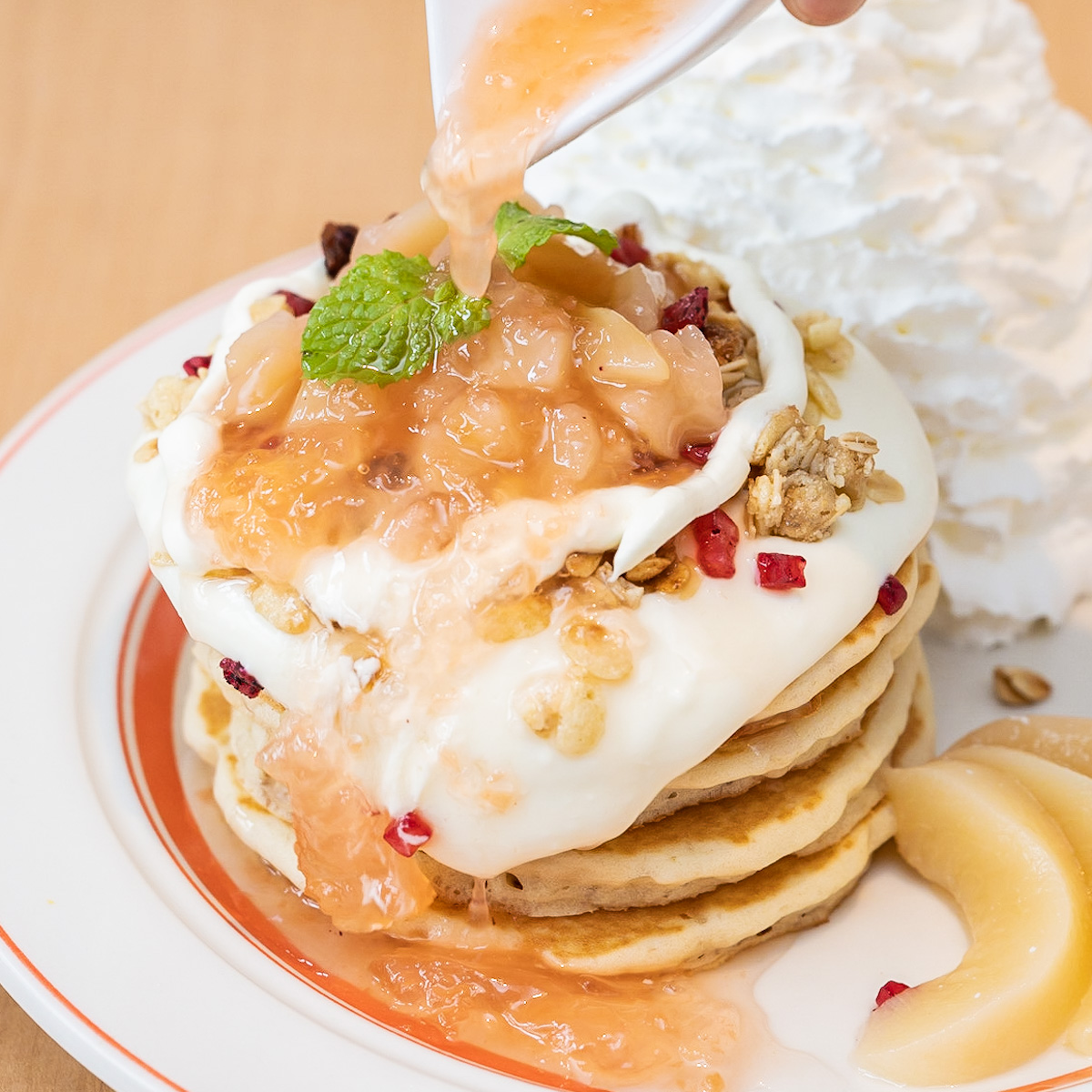 白桃をたっぷり盛り付けたパンケーキ。