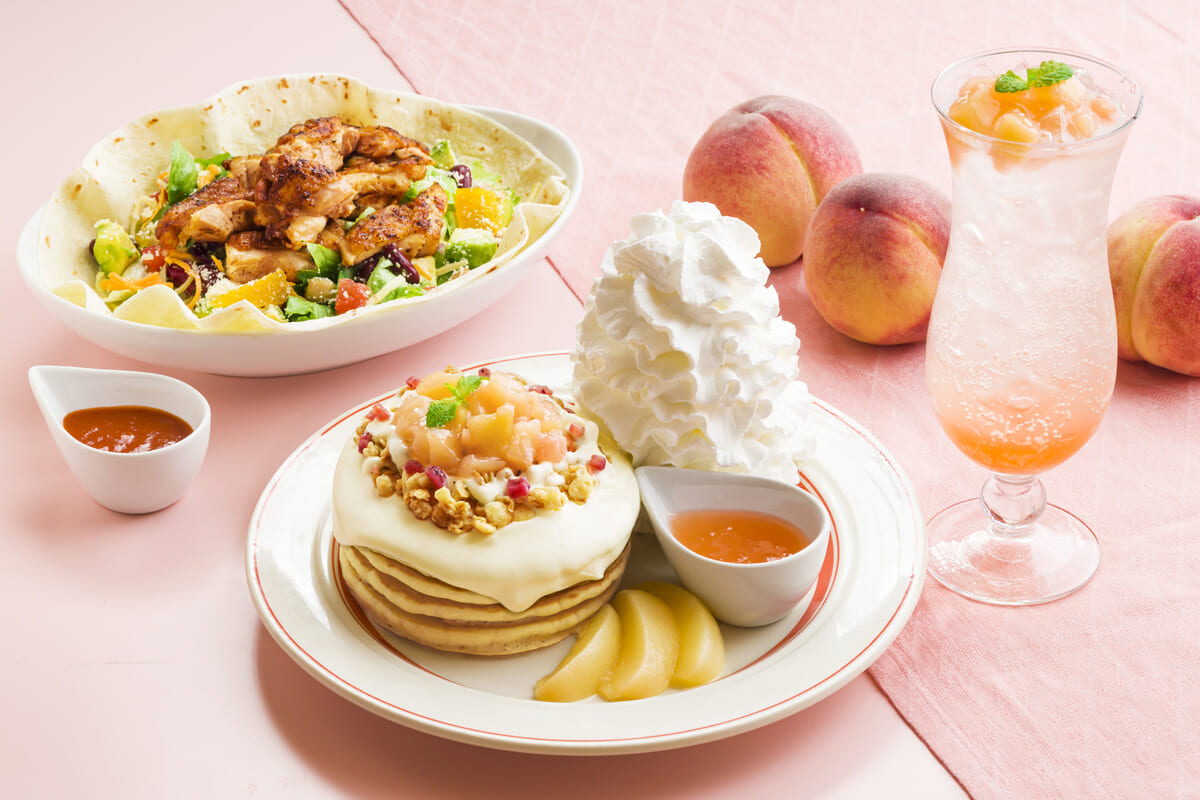 「Eggs ’n Things(エッグスンシングス)」から、爽やかな旬の桃を楽しめる「白桃のパンケーキ」と、スパイシーな味わいのサラダ「ケイジャンチキンサラダ」が期間限定で登場!