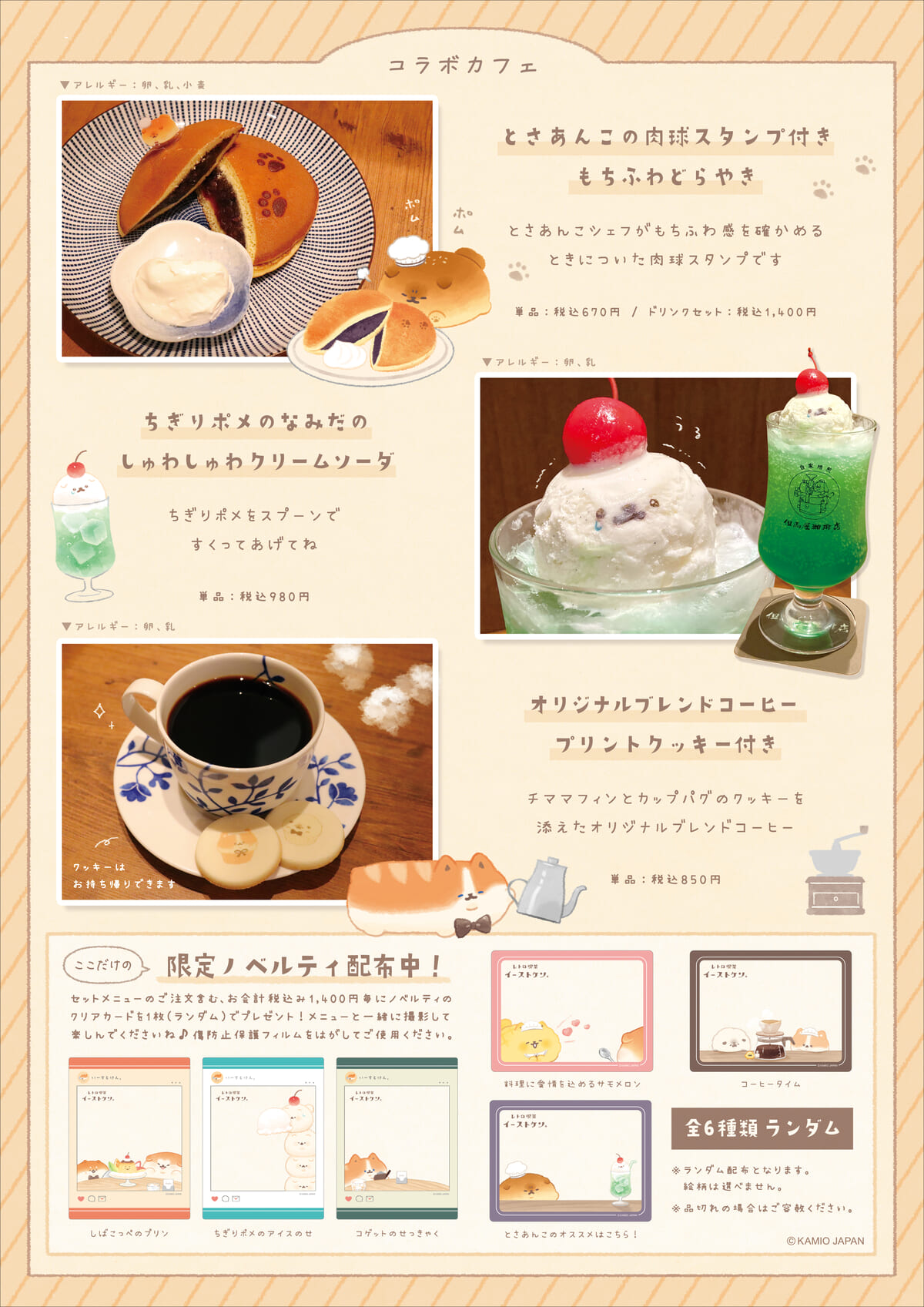 とさあんこの肉球スタンプ付きもちふわどらやき/ちぎりポメのなみだのしゅわしゅわクリームソーダ/オリジナルブレンドコーヒープリントクッキー付き
