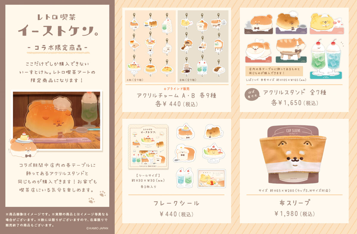 コラボカフェにて販売される、「いーすとけん。」のレトロテイストなアートを使用した限定グッズ。