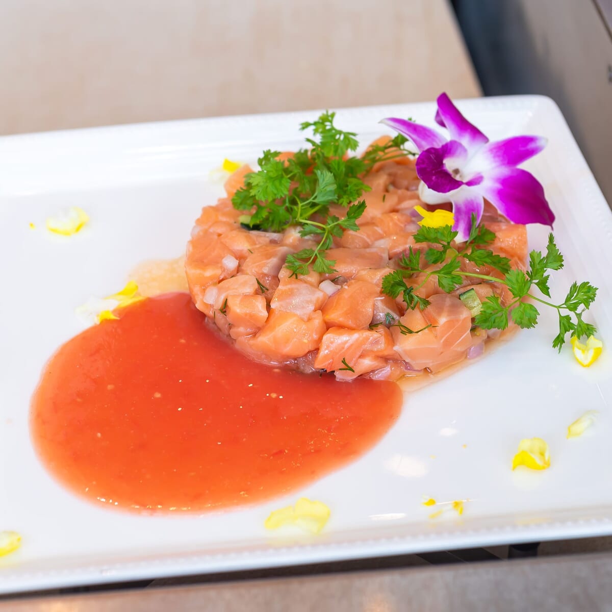 リリコイ(ハワイ語で“パッションフルーツ”)を使ったバターソースの香ばしい甘さが絶妙な「ローストサーモンリリコイバターソース」