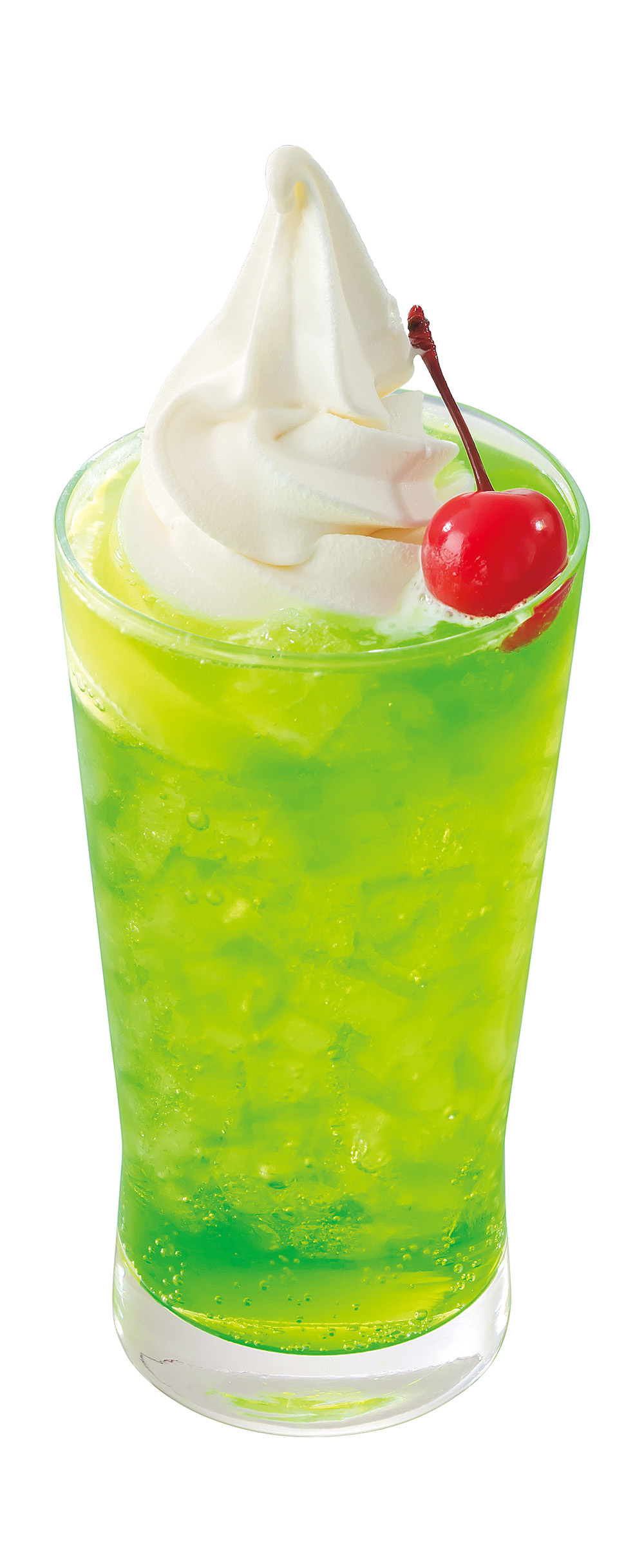 「昭和レトロクリームソーダ」は、懐かしい味わいの色鮮やかなメロンソーダに、真っ赤なチェリーと、サンマルクカフェオリジナルの北海道産ミルクを使用したソフトクリームをトッピングしたドリンク。
