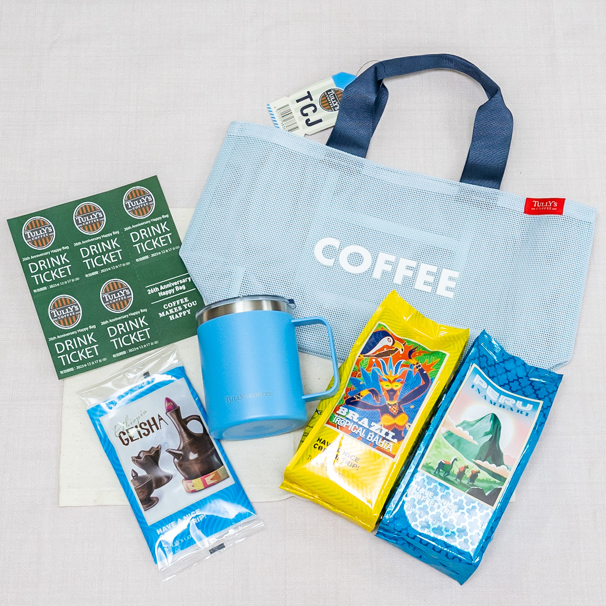 メッシュトート、タンブラー、ドリンクチケットのセット!タリーズコーヒー「26th Anniversary Happy Bag」