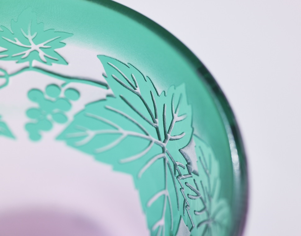 「太武朗工房」による「彫刻硝子」は、二層、三層のオリジナル色被せガラスをひとつひとつ手吹きした器へ、鉄線や葡萄などの縁起柄をサンドブラストで彫刻し、色のコントラストで表現したもの。