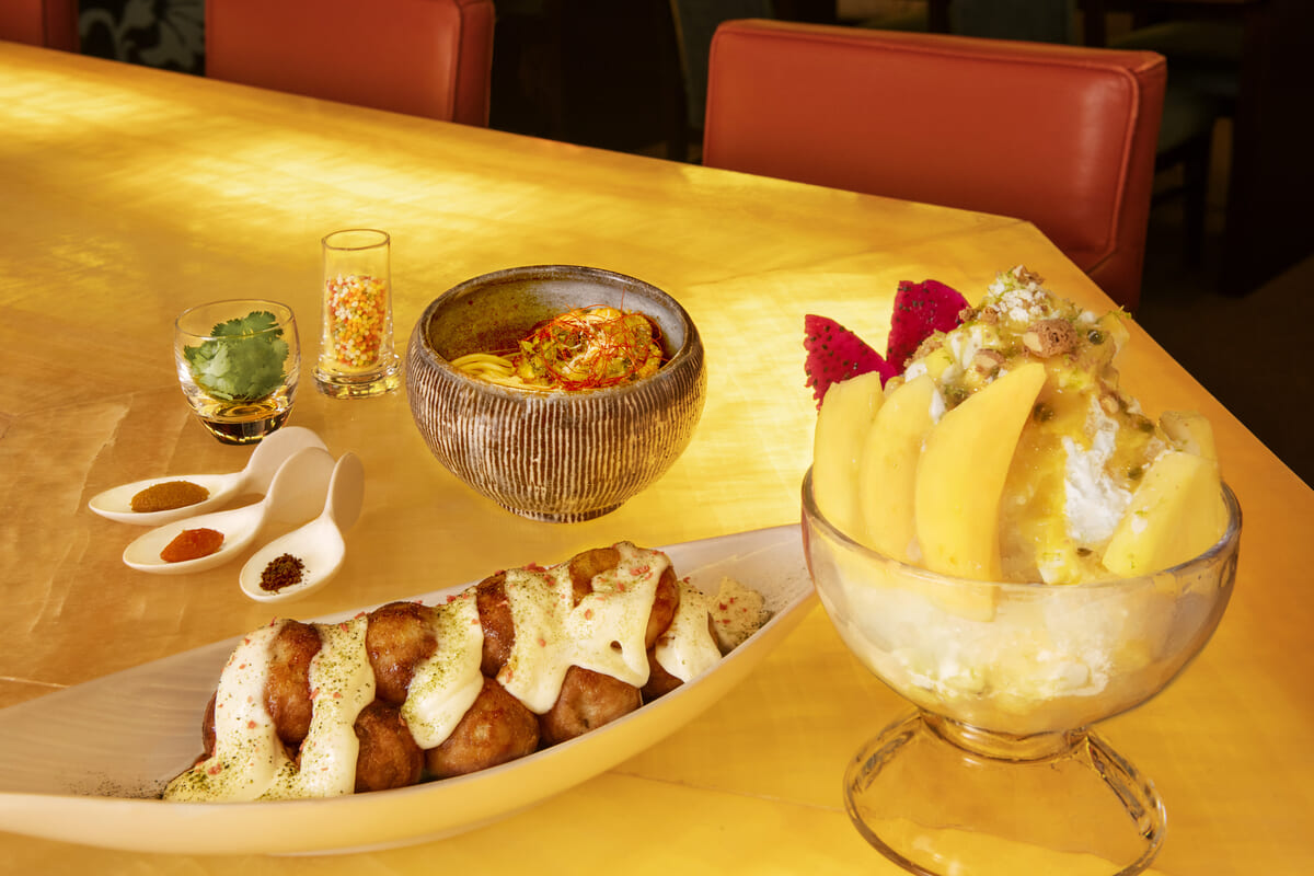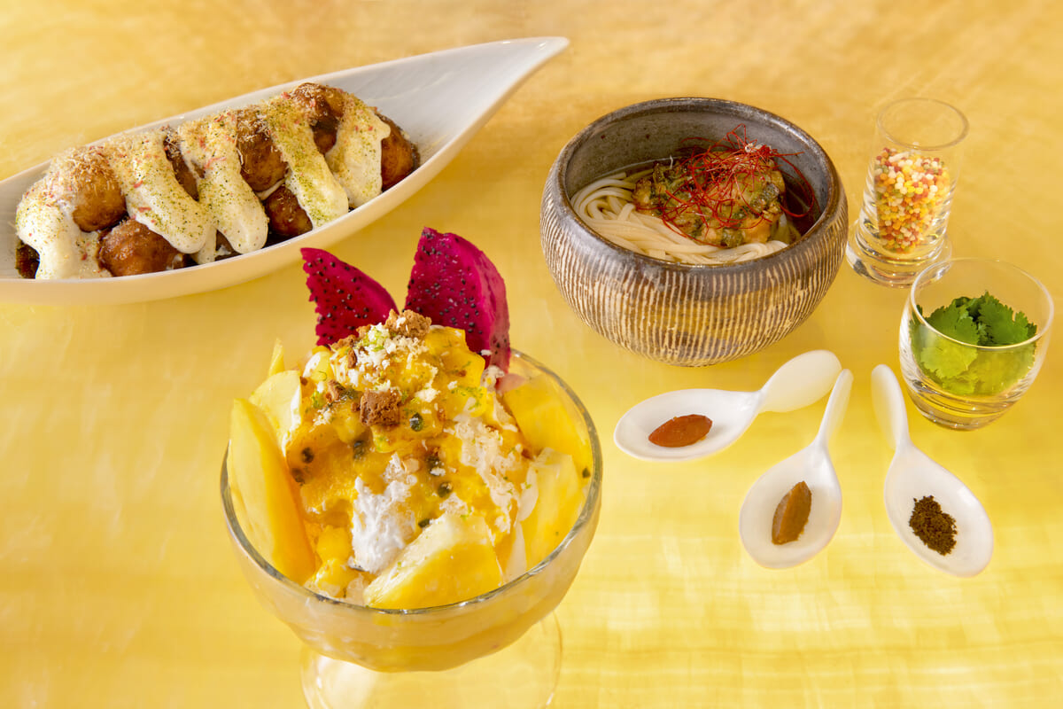 「たこ焼き二種の盛り合わせ マヨネーズエスプーマ」「カンナ風稲庭うどん オマール海老と九条葱のかき揚げ」「南国フルーツのかき氷仕立て ココナッツと黒糖のアクセント」とドリンクメニューの4品が提供されます。