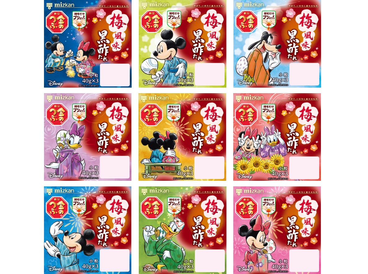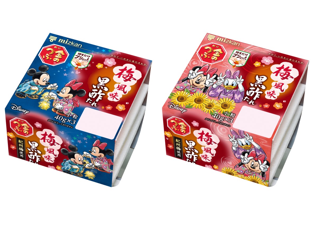 今回のパッケージは、「夏」をテーマに、「ミッキーマウス」「ミニーマウス」をはじめとした魅力的なディズニーキャラクターたちが、浴衣を着て「梅風味黒酢たれ」のパッケージに描かれています。