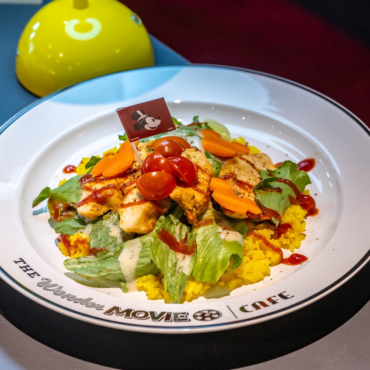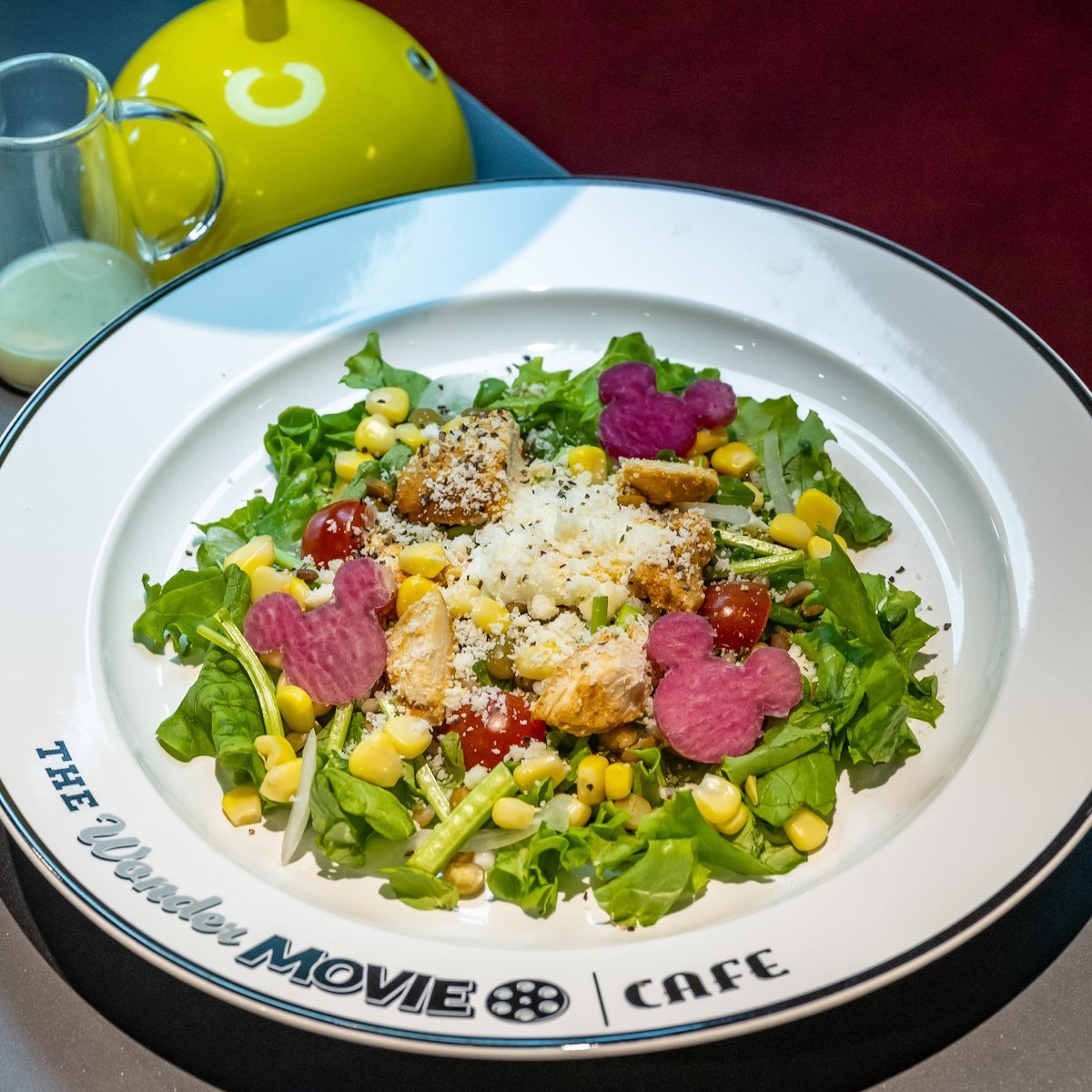 グリルされたチキンとミッキーモチーフの紅芯大根がのったシーザーサラダ。