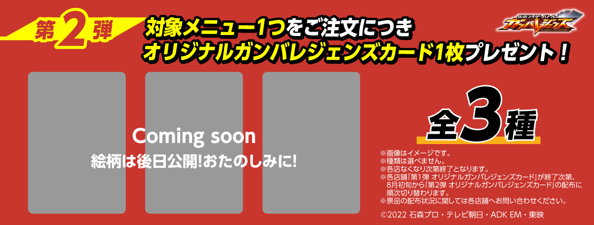 第1弾が終了し次第、8月初旬から「第2弾 オリジナルガンバレジェンズカード」に順次切り替わります。