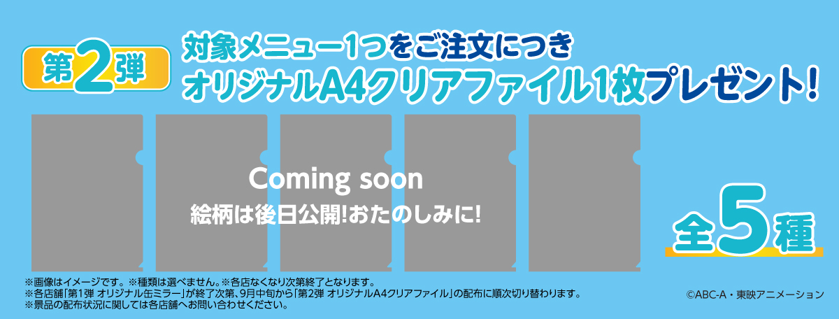 各店舗「第1弾 オリジナル缶ミラー」が終了次第、9月中旬から「第2弾 オリジナルA4クリアファイル」の配布に順次切り替わります。