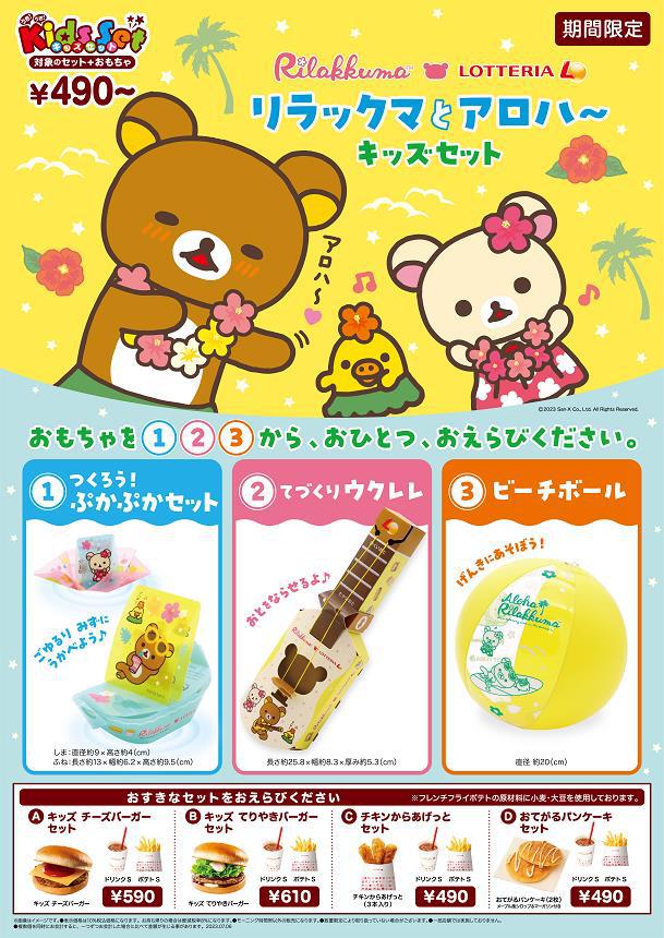 第1弾として、ロッテリアオリジナル「リラックマとアロハ~キッズセット」が、2023年7月6日(木)から期間限定で登場。