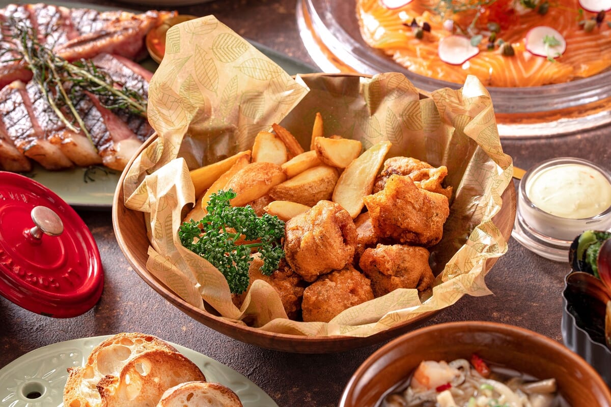 生ハムサラダ、サーモンマリネの瞬間スモーク ディル風味 イクラのクリーム添え、自家製パテ・ド・カンパーニュピペラードと共に、南国フルーツのスノーアイス、フィッシュ&フライドポテト、カルボナード アリゴ添え、鶏もも肉のブロシェット 柚子胡椒風味のオニオンコンフィ添え - <With T Bone> 16,000円
