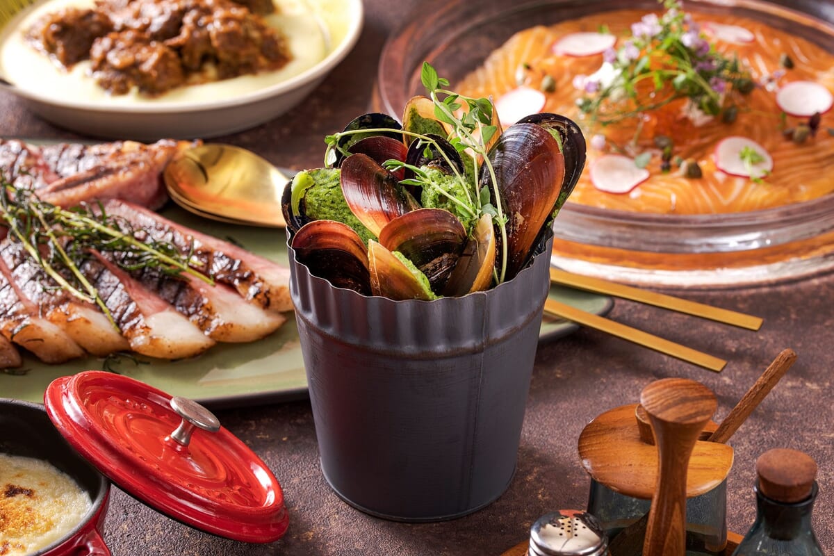 ワインにもよく合うビストロ風メニュー「ムール貝のエスカルゴバター焼き」や