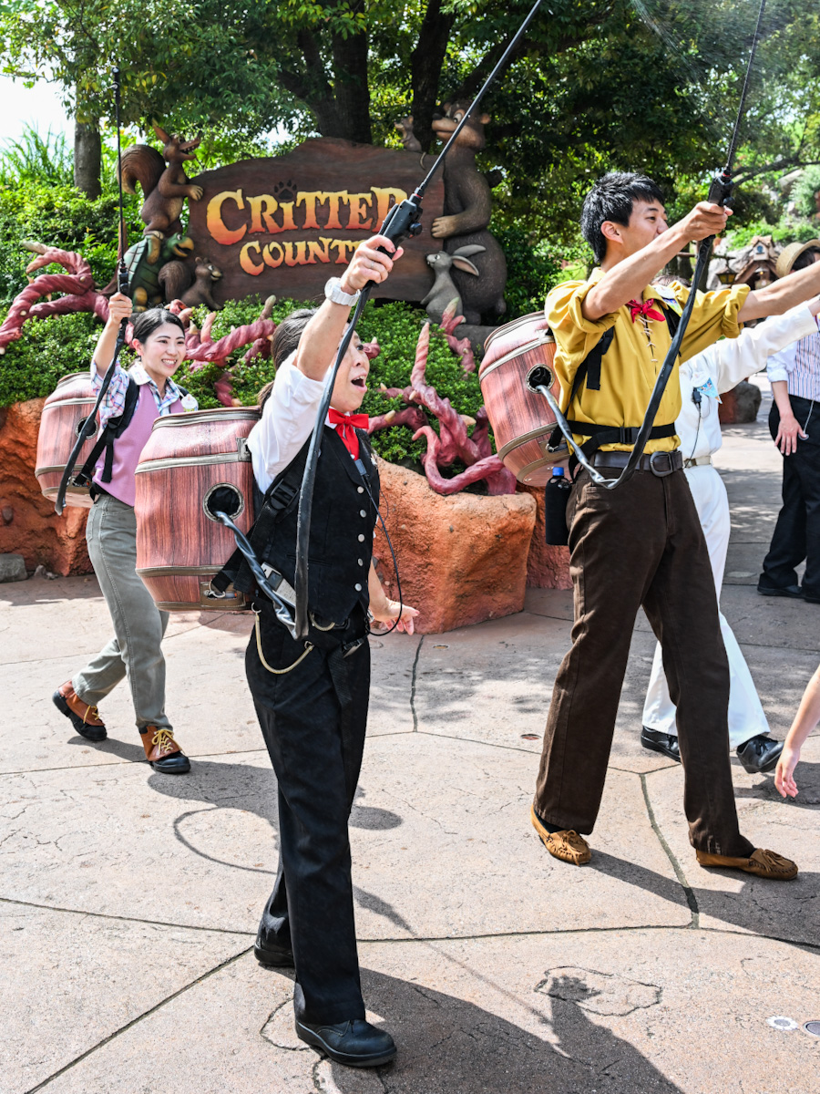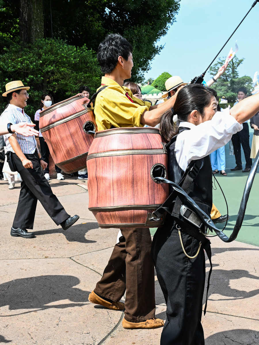 暑い夏にゲストを元気にしようと、水の入った樽を背中に背負ったキャストが登場!