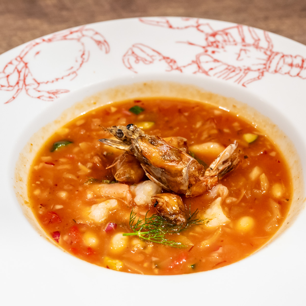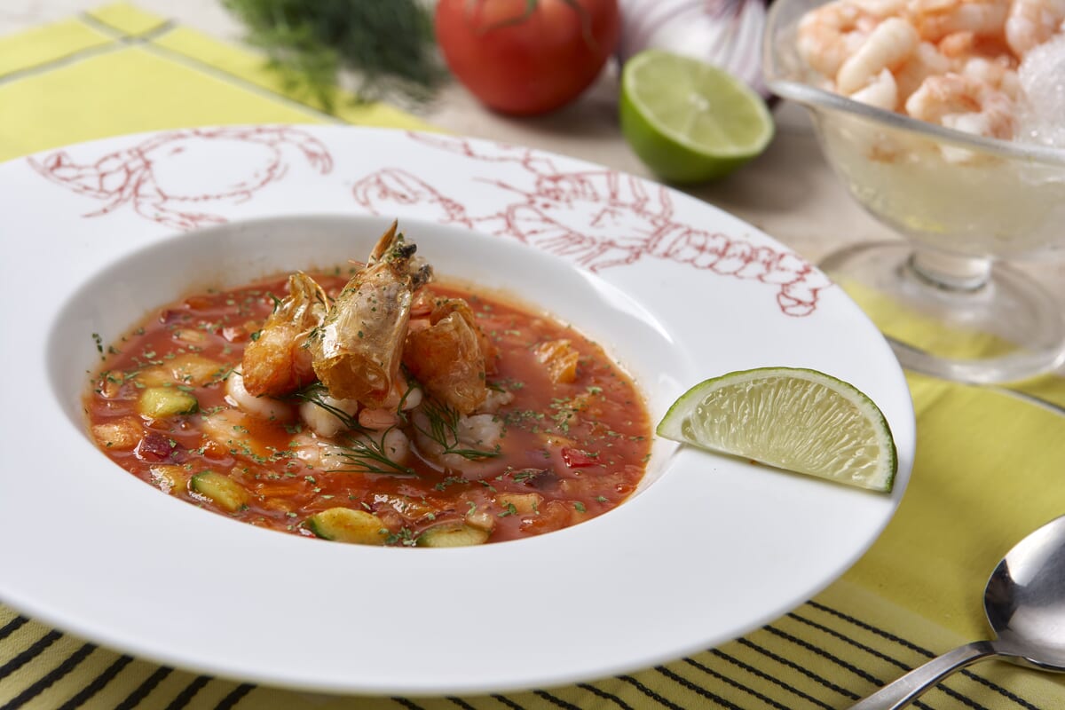 2種の海老を飾り、トマト・きゅうり・ズッキーニなどの夏野菜で具沢山に仕上げた「冷製マンハッタンシュリンプチャウダー」