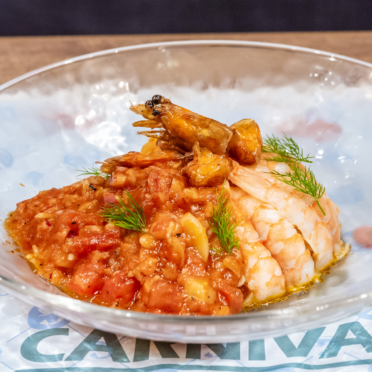ドーム状に仕立てられた海老の中には細いパスタ、カッペリーニが隠れています。