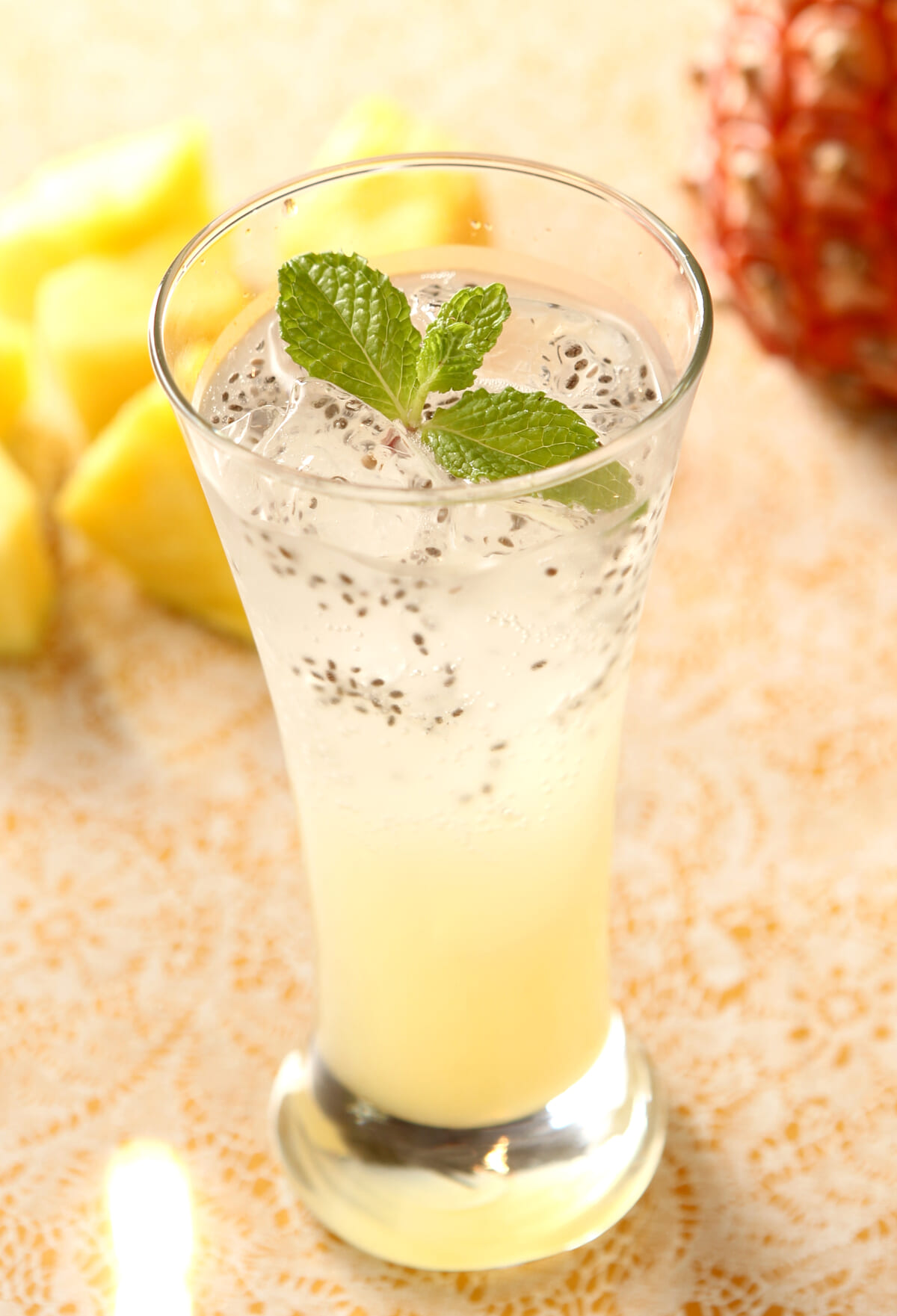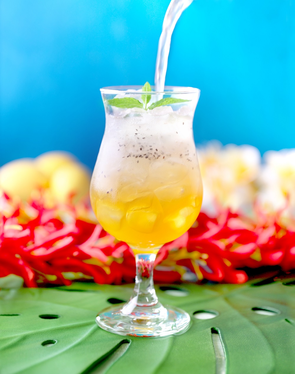 マンゴーやパッションフルーツ、グアバ、パイナップルなどのトロピカルフルーツをブレンドしたシロップとチアシードを合わせたドリンクです。