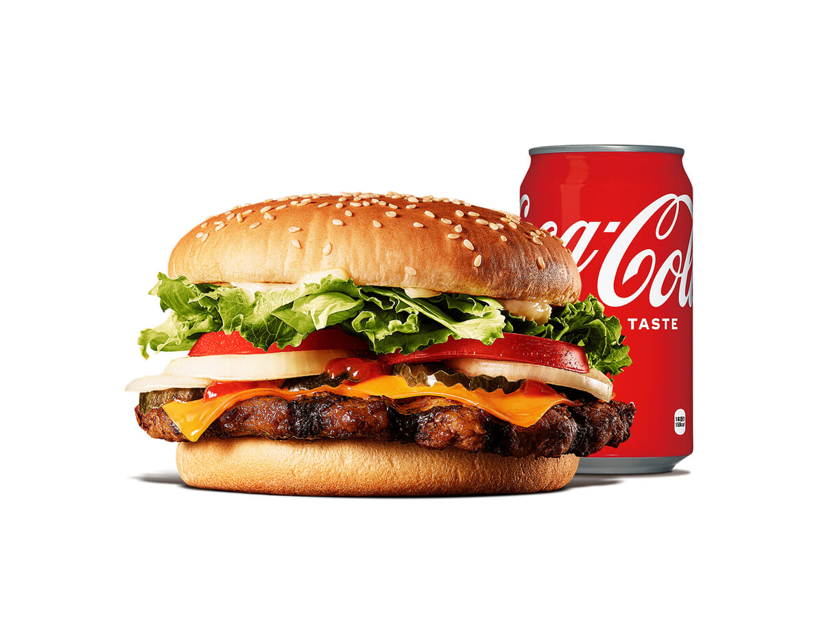 ジューシーで香ばしい直火焼きの100%ビーフパティを使用した本格大型バーガー「ワッパー」と、キンキンに冷えた「コカ·コーラ」の組み合わせが楽しめます!