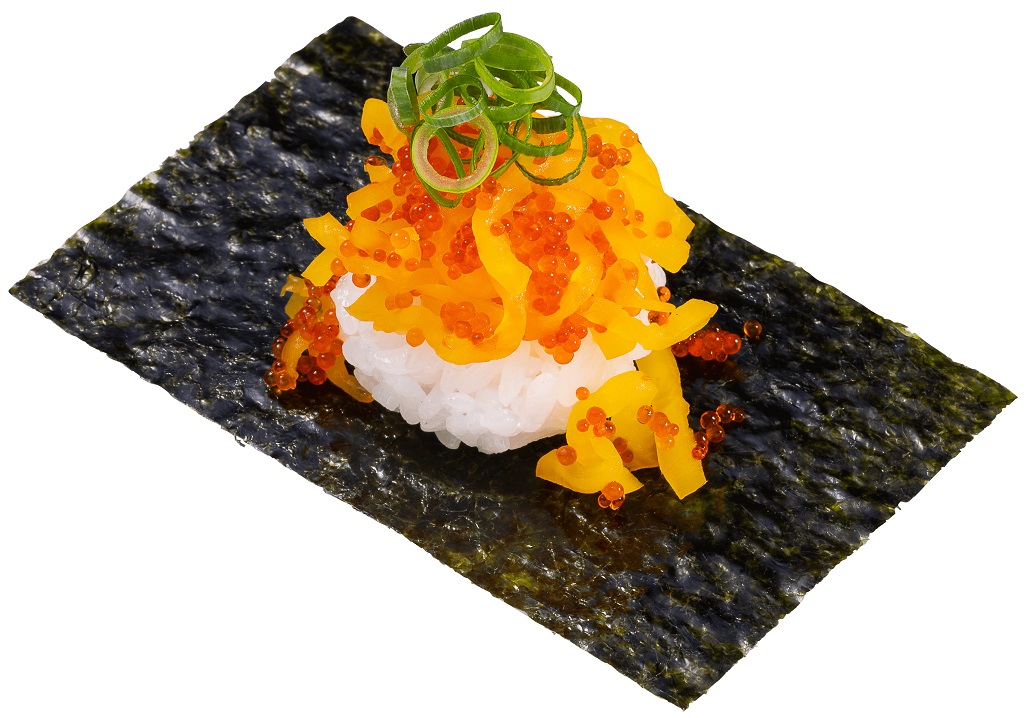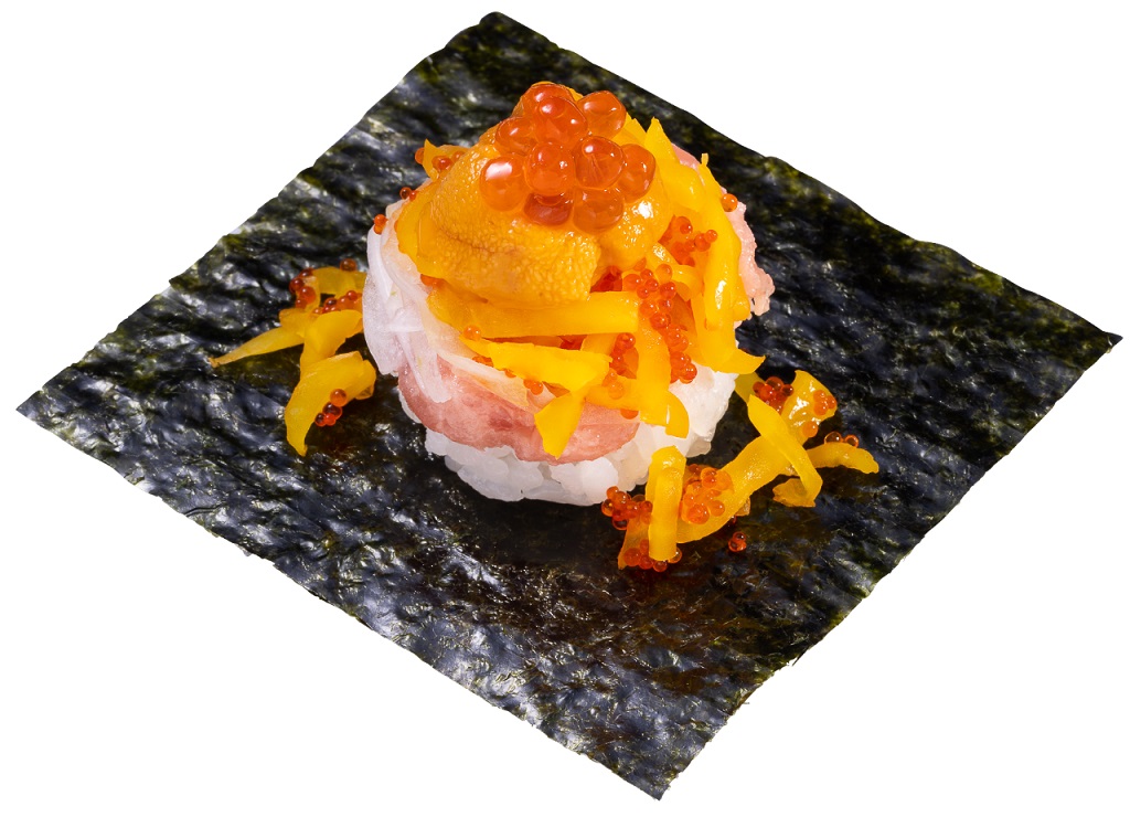 シャリの上にたくあんととびこを和えた「とびたく」に、ねぎとろとうに、いくらをのせた贅沢な包み。