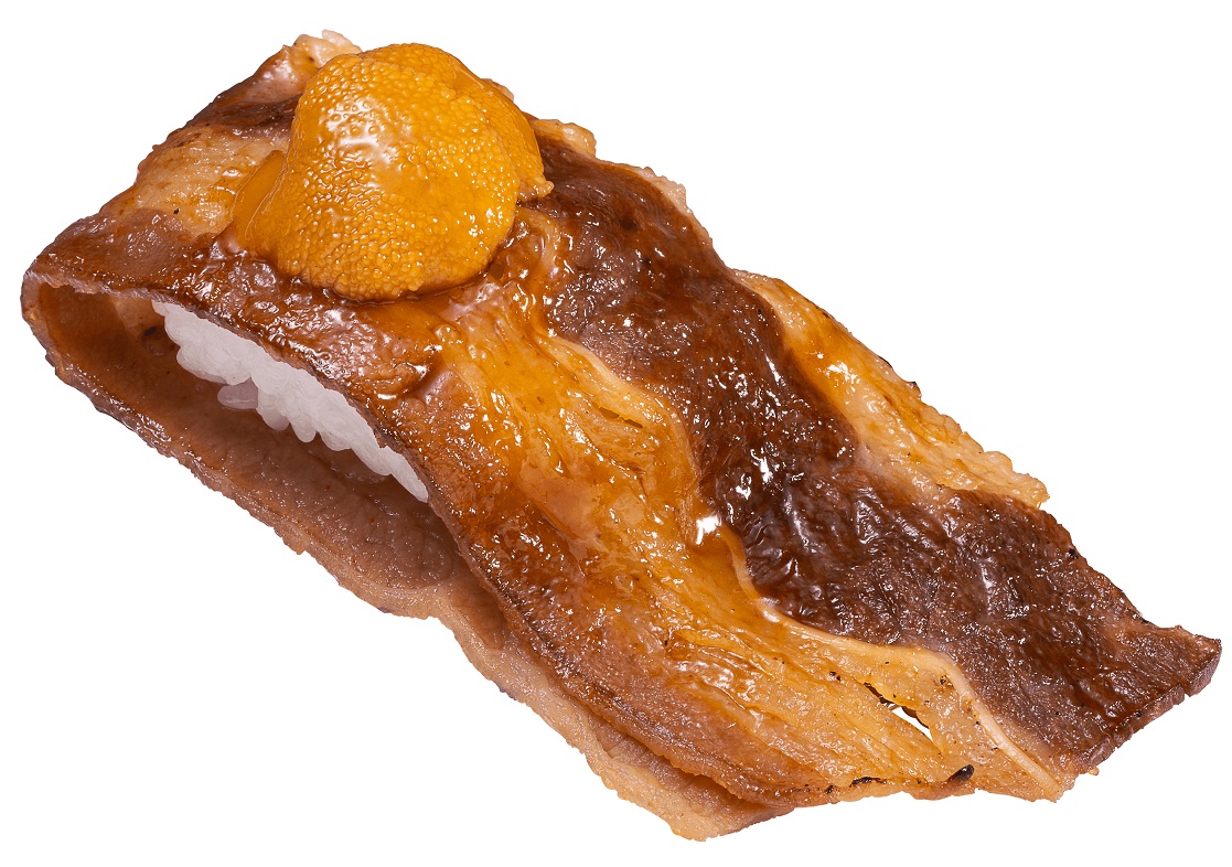 炙った大切り牛カルビの、程よい脂のコクと旨みを味わえる「大切り牛カルビ炙りうにのせ」