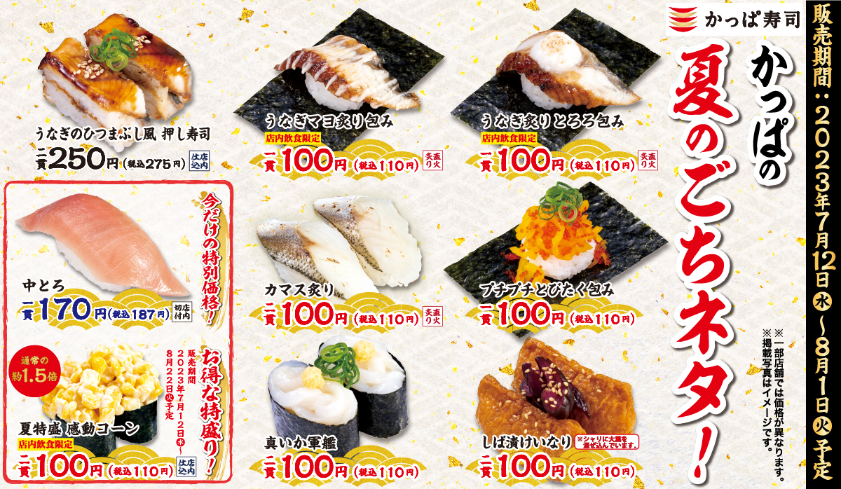 2023年7月12日〜2023年8月1日まで、かっぱ寿司全店で「うに」「いくら」「うなぎ」などの高級ネタや夏の味覚を楽しめます☆