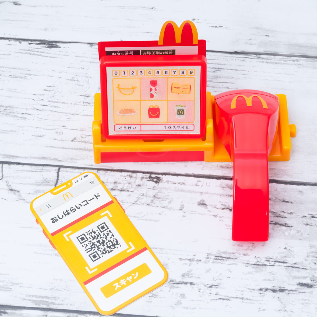 メニュー、モニターとスキャナー付きのレジスターとスマホカードがセットになった「スキャンでしはらい!レジスター」