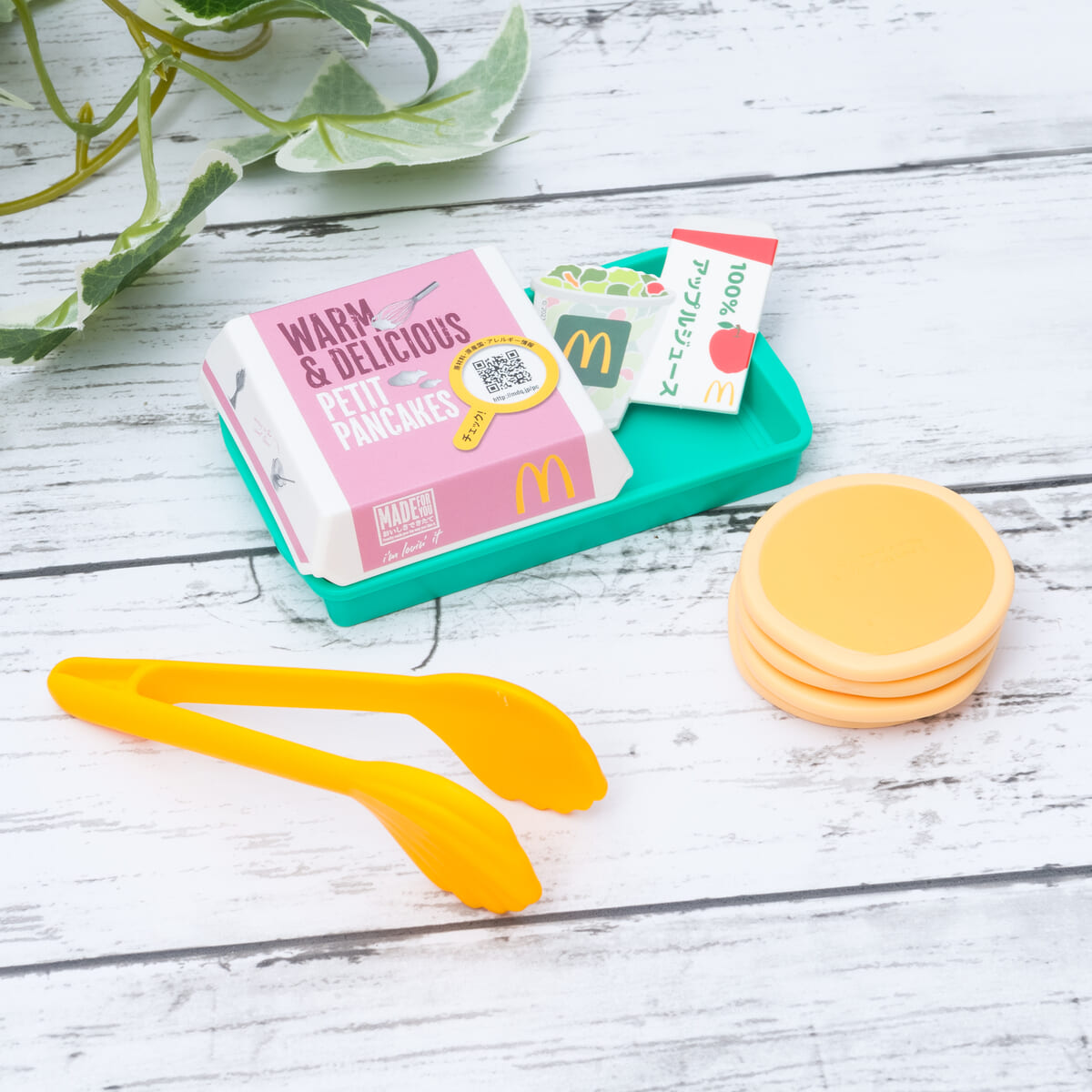 パンケーキ、ボックス、トング、トレー、サイドサラダとジュースのカードのセット。