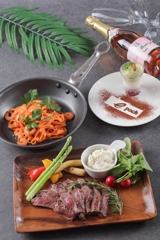 メニュー例:ビーフステーキ鉄板焼き/シーフードピッツァ/茄子とフジッリのボロネーゼ/豚肉のコートレッタ/赤魚とマチルダポテトのオーブン焼き/バーニャカウダ/ブルスケッタ/ピスタチオとチーズクリームのマリトッツォ/パンナコッタ 等