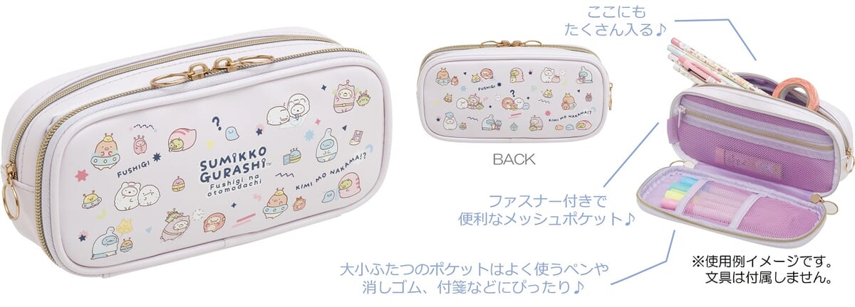 「ふしぎなおともだち」テーマの「すみっコ」たちが散りばめられた、フロントポケットペンポーチ。
