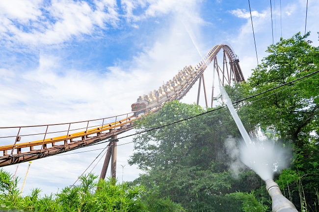 ウォーターキャノンの大放水や、夏をテーマにした楽曲と共に楽しむジェットコースター。