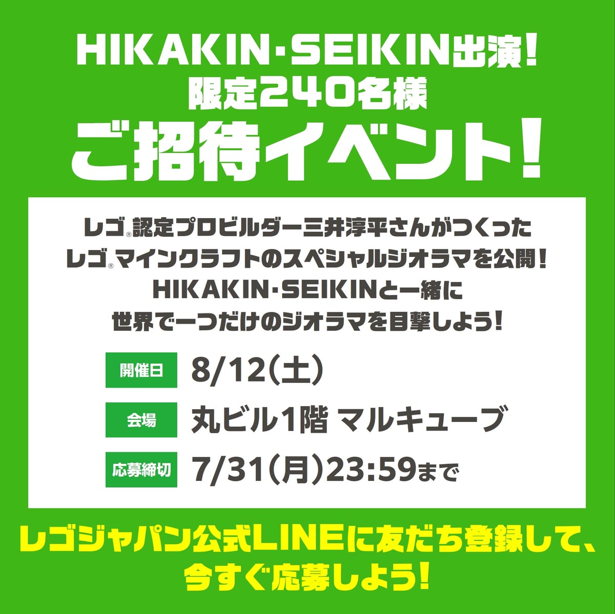 8月12日には、イベント「マインクラフトの世界を全部レゴ(R)ブロックでつくったらスゴイことになった! in 丸ビルマルキューブ」を実施予定。