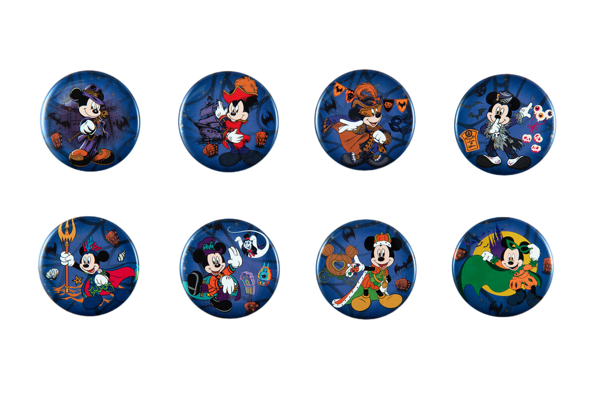 これまでのハロウィーンのコスチュームを着たミッキーが描かれた缶バッジセット。