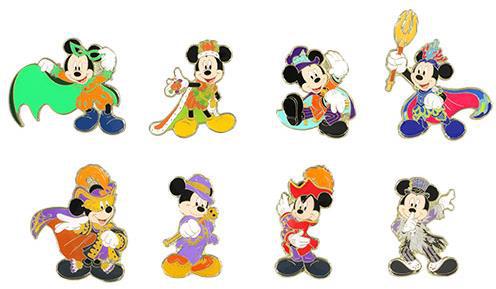 これまでのハロウィーンのコスチュームを着たミッキーが描かれたピンバッジの8個セットです。