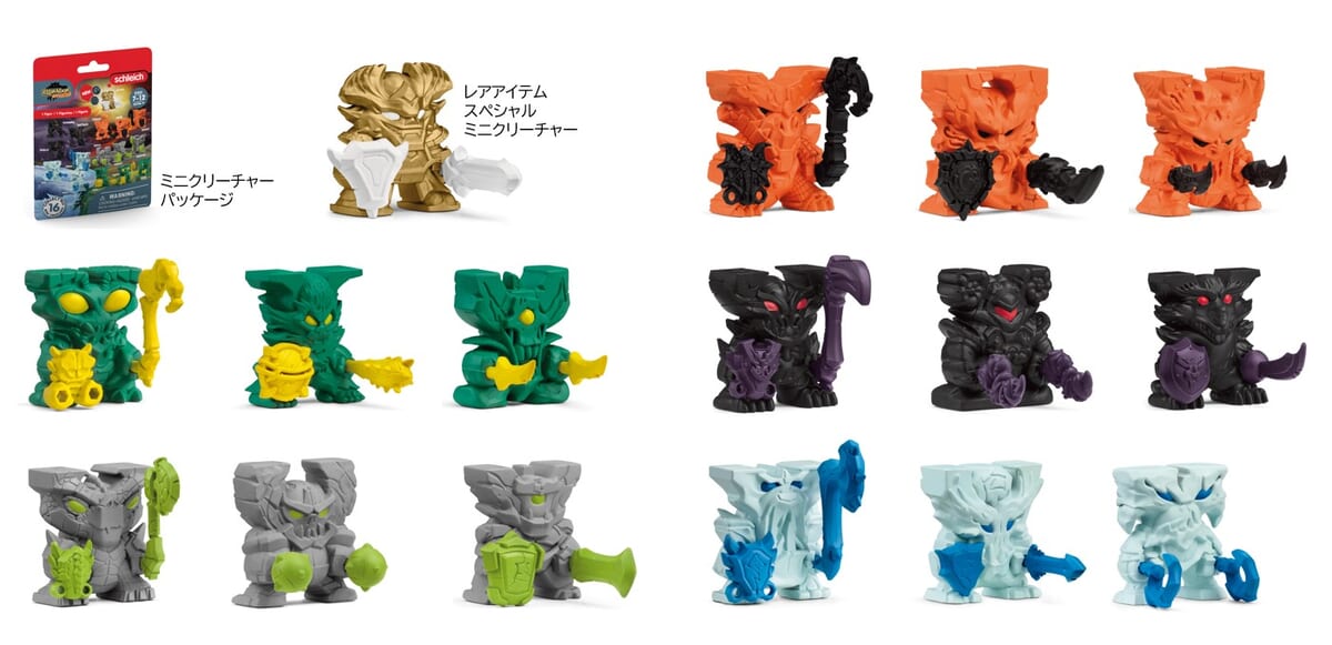 「溶岩」「氷」「石」「ジャングル」「影」の5種類のテーマから、ミニクリーチャー3体とレアアイテムのゴールデンミニクリーチャーの全16種類をラインナップ。