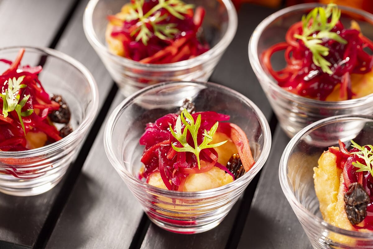 「いろいろなシーフードのエスカベッシュ」は、一口大のフィッシュフライに鮮やかな紫キャベツを合わせたセイボリー。