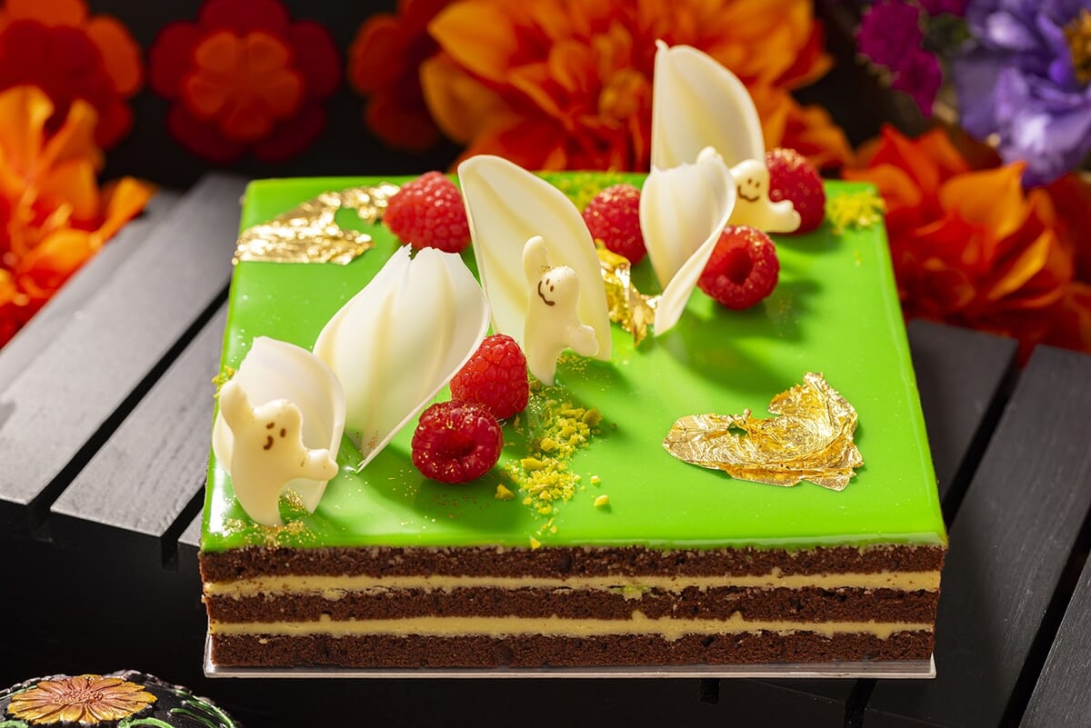 「チョコレートスポンジとピスタチオのガナッシュサンド」は、オバケたちの姿がかわいく、ピスタチオの風味が豊かな一品です!