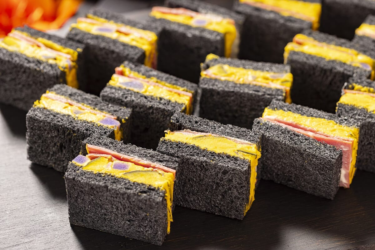 セイボリーには、かぼちゃと紫芋を合わせたサラダを真っ黒なパンで挟んだ「パンプキン&シャドークイーンの竹炭サンド」も登場。