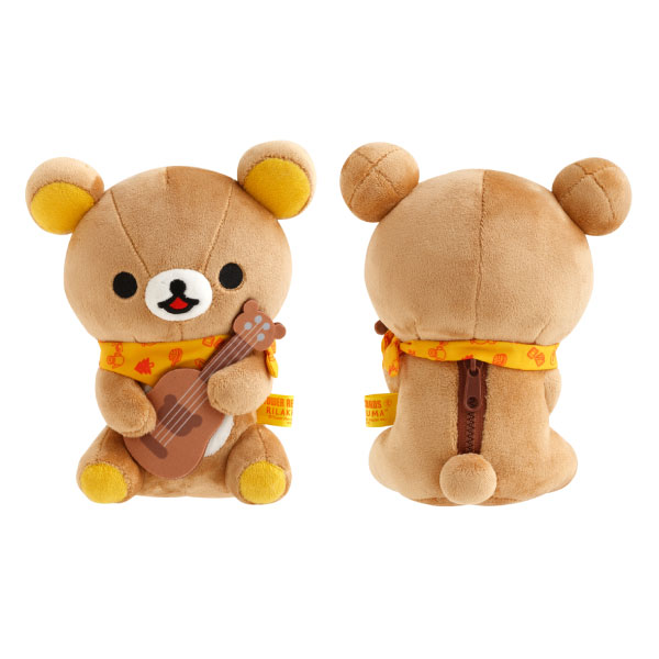 ギターを手に、歌っている様子の「リラックマ」ぬいぐるみ。