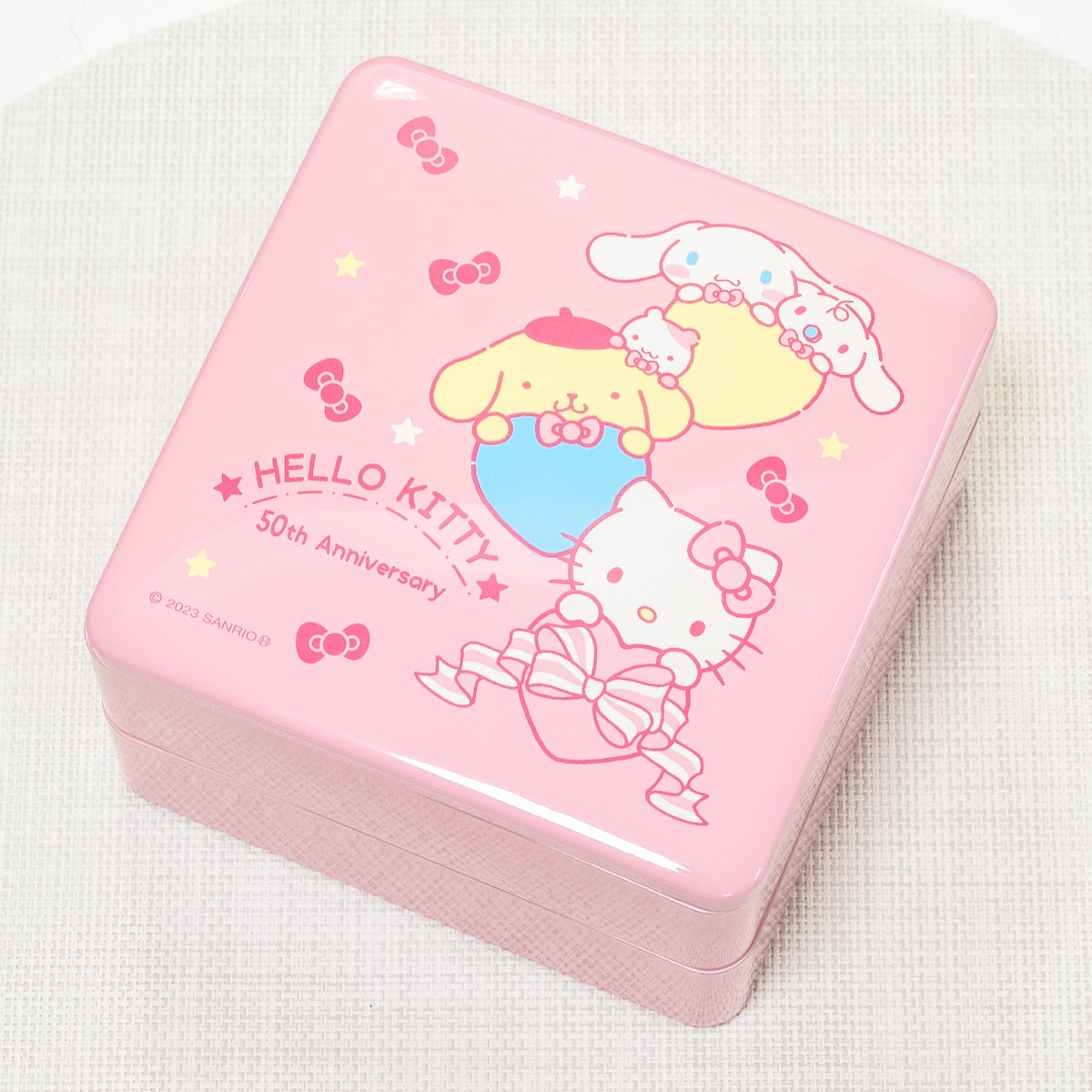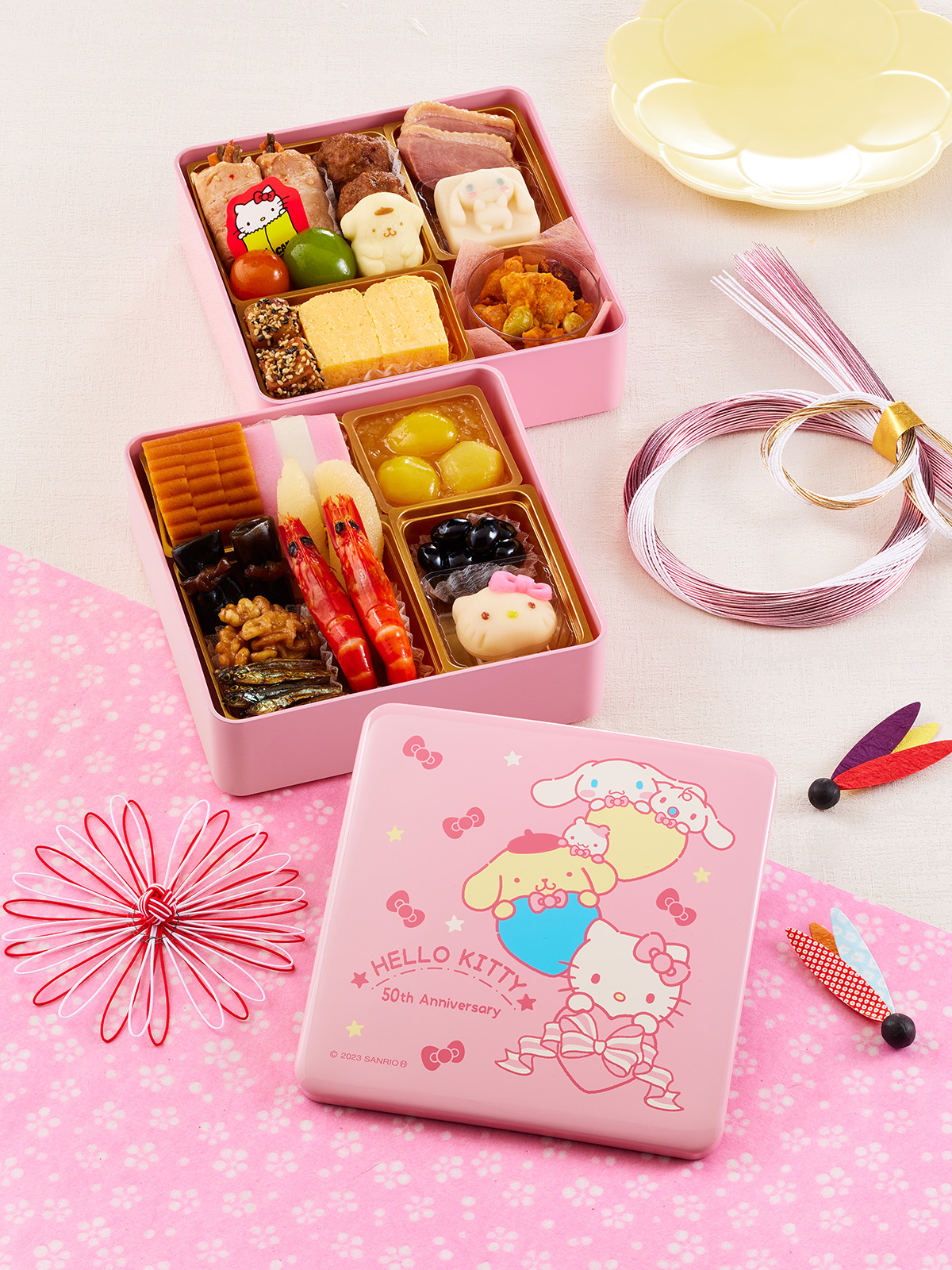 お重箱は2024年11月1日に50周年を迎える「ハローキティ」を、「シナモロール」と「ポムポムプリン」が祝福しているデザイン。