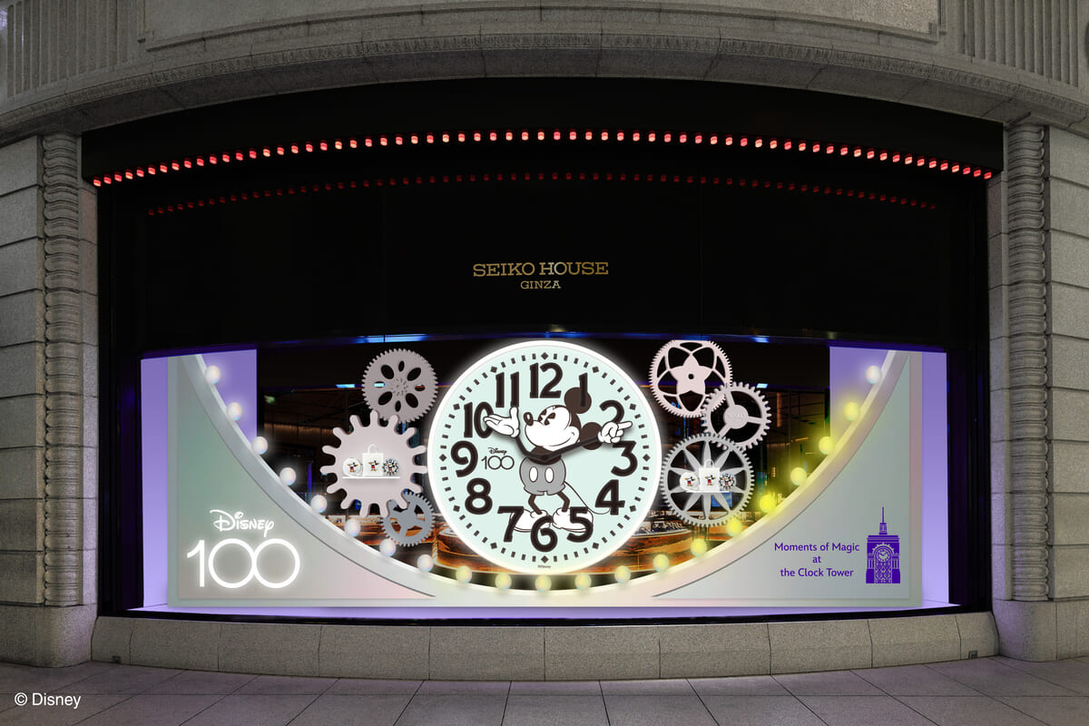 ショーウインドウの中央には、「SEIKO HOUSE GINZA」の時計塔と同じサイズの「ミッキーマウス」デザインの時計を配置。