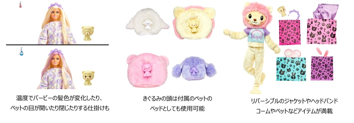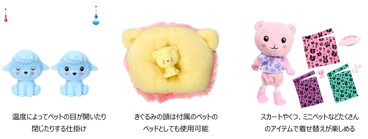 また、温度によってバービーの髪色が変化したりペットの目が開いたり閉じたりする変化など、わくわくする仕掛けが満載!