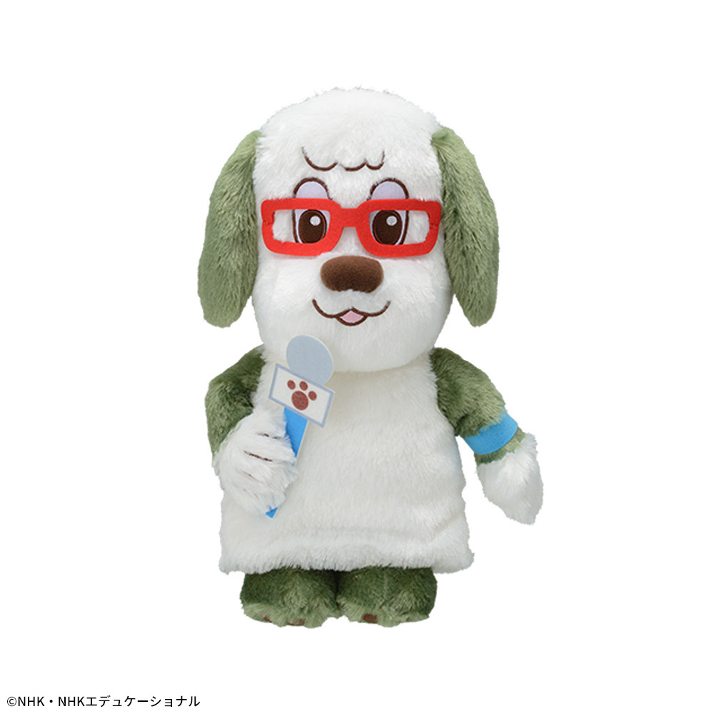 レポーター風の衣装を着た「ワンワン」のぬいぐるみ。