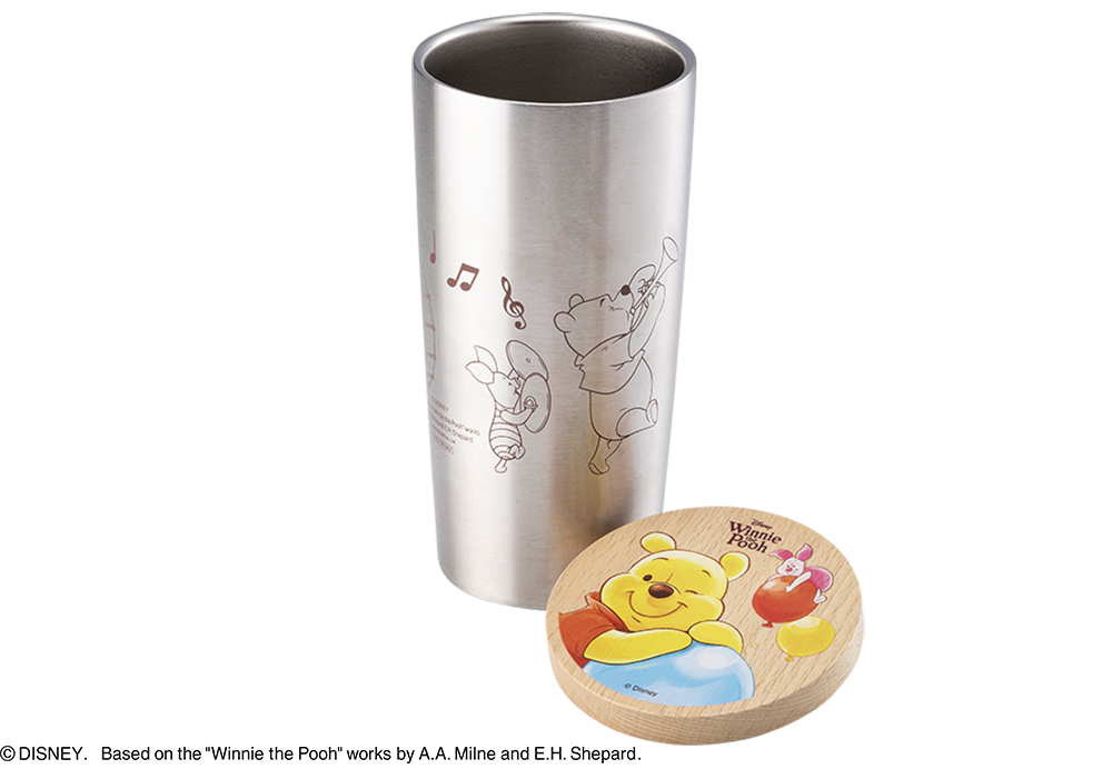 真空タンブラーのフタには「プーさん」と「ピグレット」が風船で遊ぶデザイン、タンブラーには鼓笛隊を組んだ仲間たちが描かれた、今回だけの特別なデザインです。