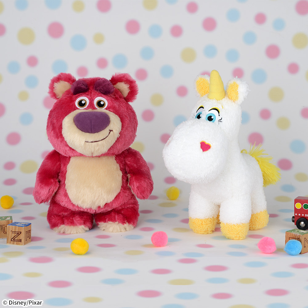 「トイ・ストーリー」の人気キャラクター「ロッツォ」と「バターカップ」のかわいいぬいぐるみ。