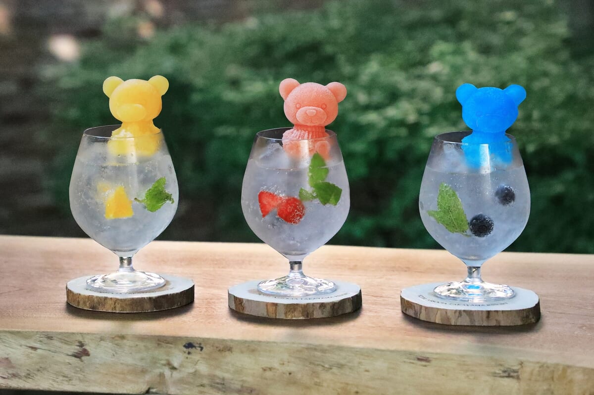 グラスの中でちょこんと座るブルーベリー果汁のクマ氷が夏らしさを引き立てます。