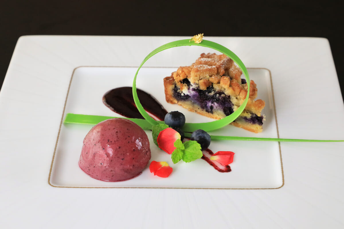 アソシア畑で収穫されたブルーベリーをふんだんに使用したチーズケーキにブルーベリーアイスを添えたタルト。