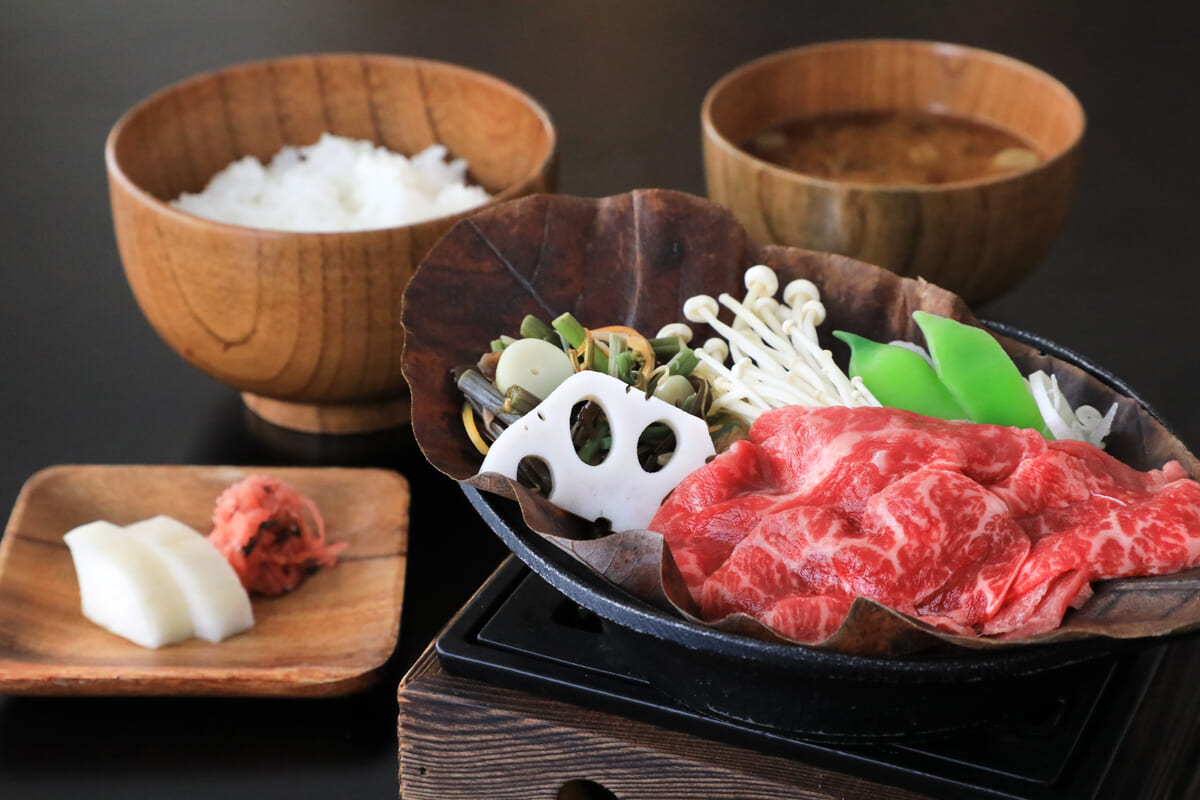 飛騨高山の郷土料理である朴葉味噌焼きが飛騨牛で味わえる「飛騨牛朴葉味噌焼御膳」